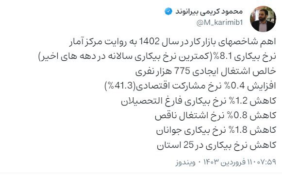 به گزارش شهر مردم، محمود کریمی بیرانوند در صفحه شخصی خودش در شبکه ویراستی با اعلام اهم شاخصهای بازار کار در سال ۱۴۰۲ به روایت مرکز آمار نوشت: نرخ بیکاری سال ۱۴۰۲ به ۸.۱ درصد رسید که کمترین نرخ بیکاری سالانه در دهههای اخیر است.