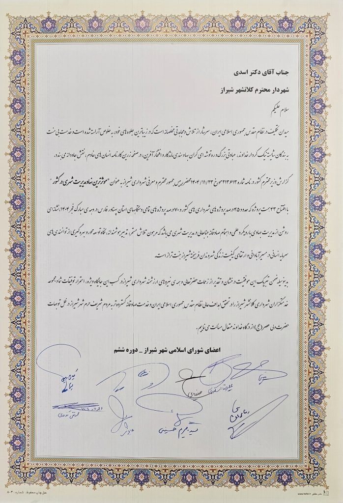 گزارش وزیر محترم کشور در نامه شماره ۲۱۳۶۱۳ مورخ ۲۳ بهمنماه ۱۴۰۴، محضر رئیسجمهور محترم و معرفی شهرداری شیراز به عنوان مؤثرترین نهاد مدیریت شهری در کشور با افتتاح ۴۳ همت پروژه که حدود ۵۰ درصد پروژههای شهرداریهای کشور و ۷۰ درصد پروژههای تمامی دستگاههای استان پهناور فارس در دهه مبارک فجر ۱۴۰۴ را شامل میشود، نشانهای روشن از مدیریت جهادی با رویکرد علمی و اهتمام صادقانه جنابعالی در مدیریت شهری است که مرهون تلاش مستمر، تدبیر هوشمندانه، نگاه توسعهمحور و بهرهگیری از توانمندیهای سرمایه انسانی در مسیر آبادانی و ارتقای کیفیت زندگی شهروندان فرهیخته شیراز، جنتتراز است.