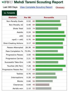 در جدول زیر آمار و ارقام مهدی طارمی بهترین گلزن سه فصل اخیر تیم پورتو را می بینیم که تقریبا همه آیتم ها نوار سبز رنگ را نشان می دهند که نمایانگر عملکرد عالی مهدی طارمی طی یکسال گذشته است. طارمی در مجموع 2600 دقیقه ای که در رقابت های لیگ پرتغال برای پورتو به میدان رفت توانست 22 گل و 7 پاس گل به نام خود ثبت کند، او در مسابقات لیگ قهرمانان اروپا نیز درخشان ظاهر شد و موفق شد آمار 5 گل و 2 پاس گل را برای خود و تیمش رقم بزند.